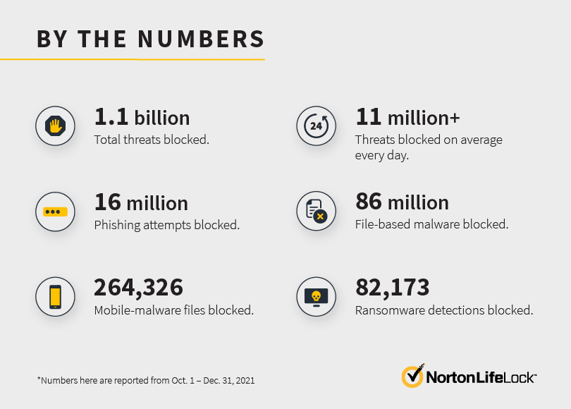 In 2021, Norton thwarted 3.6 billion threats, or nearly 10 million threats per day, including 1.1 billion threats between October and December. Norton blocked: